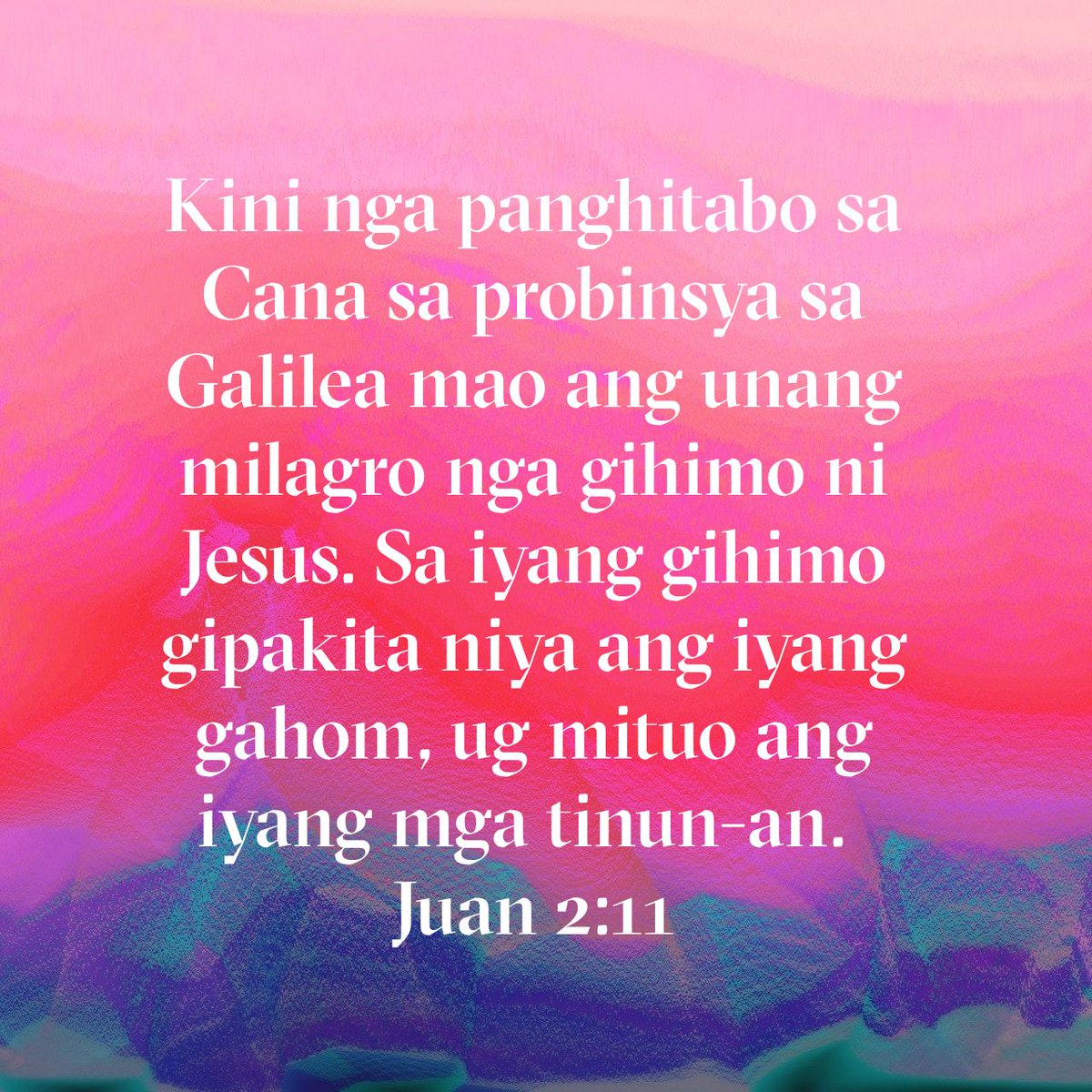 11 Kini nga panghitabo sa Cana sa probinsya sa Galilea mao ang unang milagro nga gihimo ni Jesus. Sa iyang gihimo gipakita niya ang iyang gahom, ug mituo ang iyang mga tinun-an.