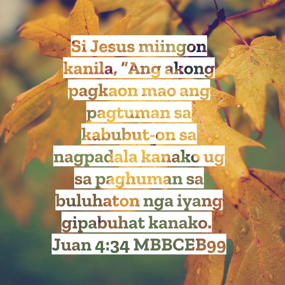 34 Si Jesus miingon kanila, "Ang akong pagkaon mao ang pagbuhat sa kabubut-on sa nagpadala kanako, ug ang pagtuman sa ipabuhat niya.